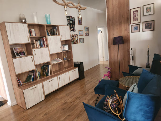 בית פרטי בישוב מיתר בנגב. נגיעות קלות בעיצוב במרחב הציבורי - קיר מפריד דקורטיבי משולב עם בר. הבר כולל מקרר יינות ואחסון לכל אביזרי המשקאות ומשקאות שונים.